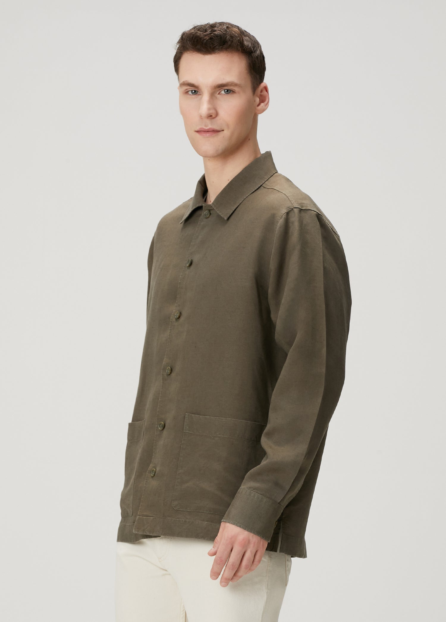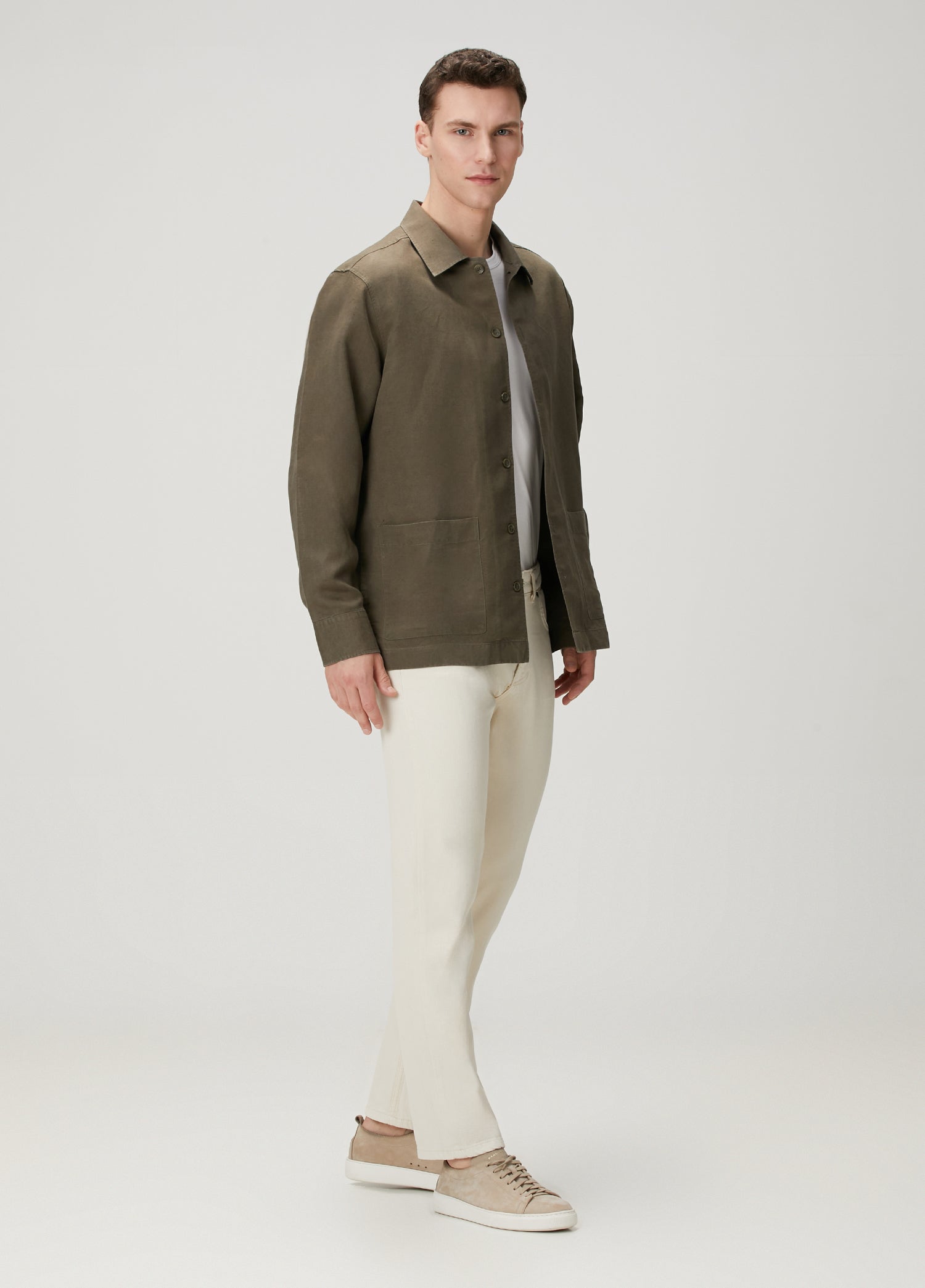 Haki tonu ile keten beyaz gömlek ve muscle fit tişörtlerimizle mükemmel uyum sağlar.