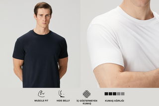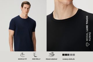 This exclusive t-shirt, crafted with Qsimple Modal Luxe Touch™, offers a luxurious look with its silky and lustrous texture. The "Muscle Up Fit" cut accentuates muscles, providing a strong posture. It maintains its shape and is breathable. Feel the luxury on your skin; simple yet impressive, experience comfort and style all in one.
