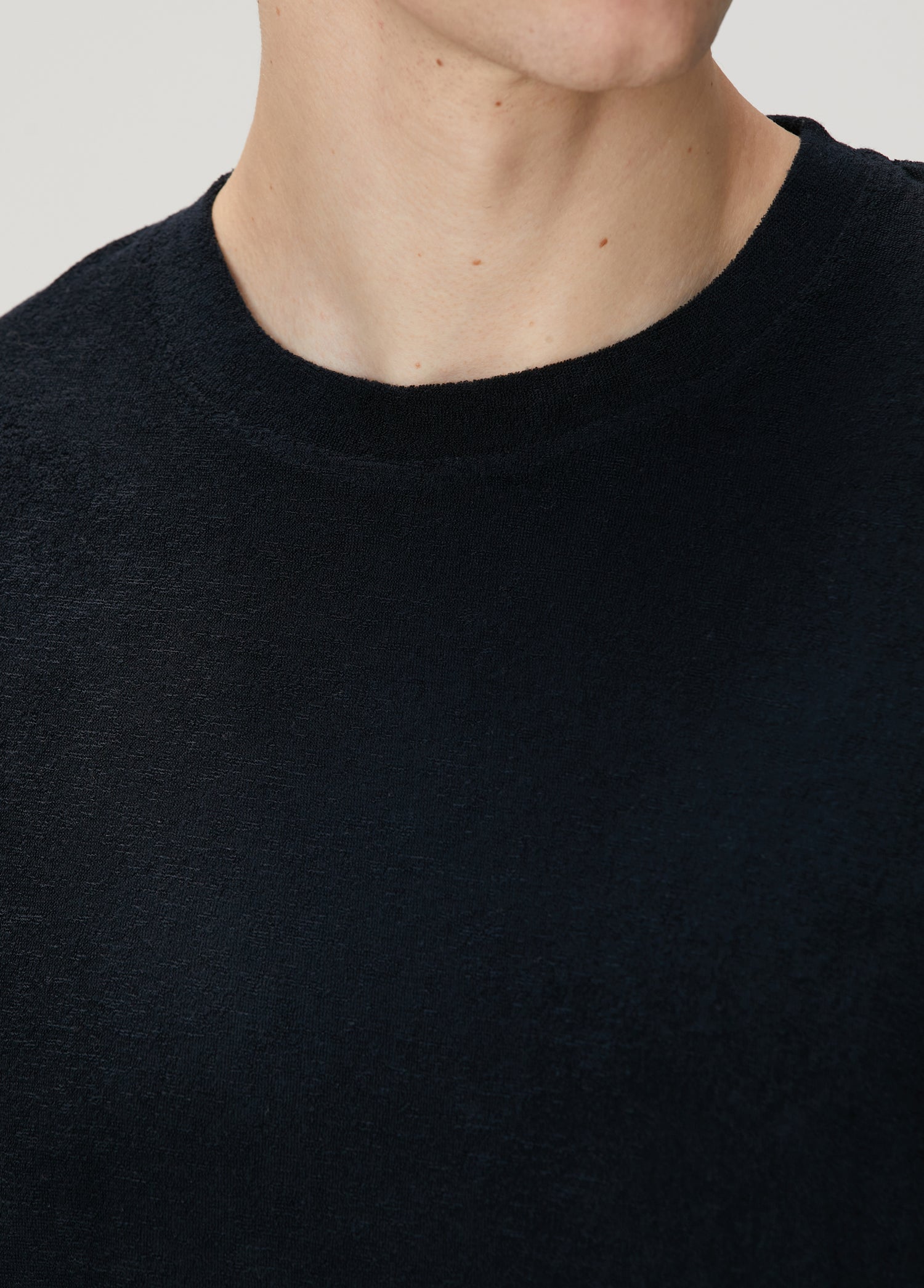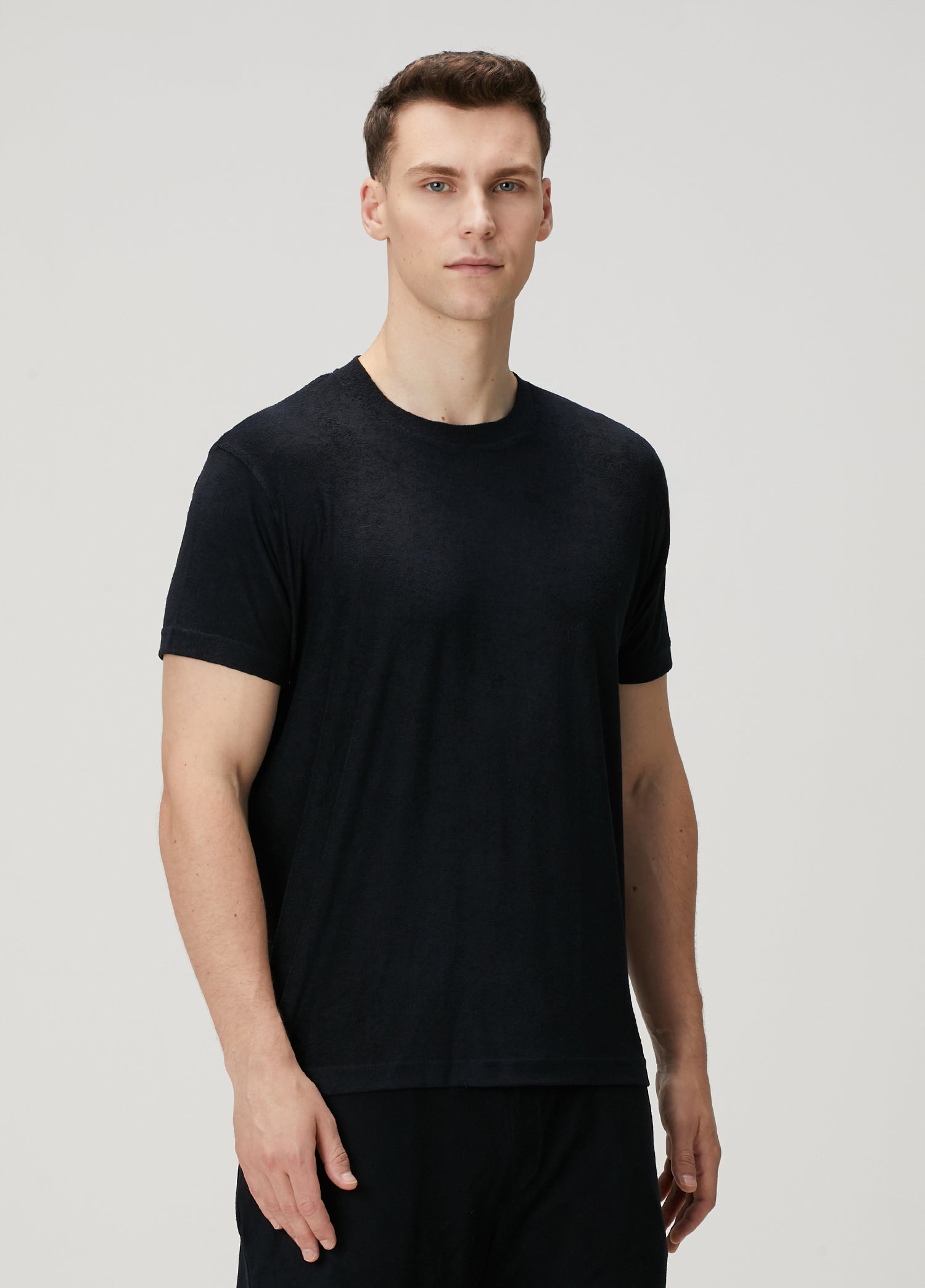 Havlu kumaş dokusunun zamansız şıklığı, pamuk değil modal olarak örülmüş ve lüks bir zerafet katılmıştır. Bu özel kumaş, markamıza özel MuscleFit tişört kalıbıyla birleşiyor.